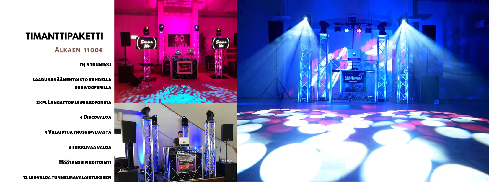 Kaikki hinnaston paketit sisältävät tarvittavan kaluston sekä pystyttämisen paikalle. Hinta sisältää laitteiston kasaamisen ennen tilaisuutta ja purun tilaisuuden jälkeen ja puheiden miksaamisen. Dj soittaa 6tuntia, lisätunnit 40 €/tunti. Hinta sisältää toimituksen Uudellemaalle. Muualle lisätään hintaan kulukorvaus tapauskohtaisesti.